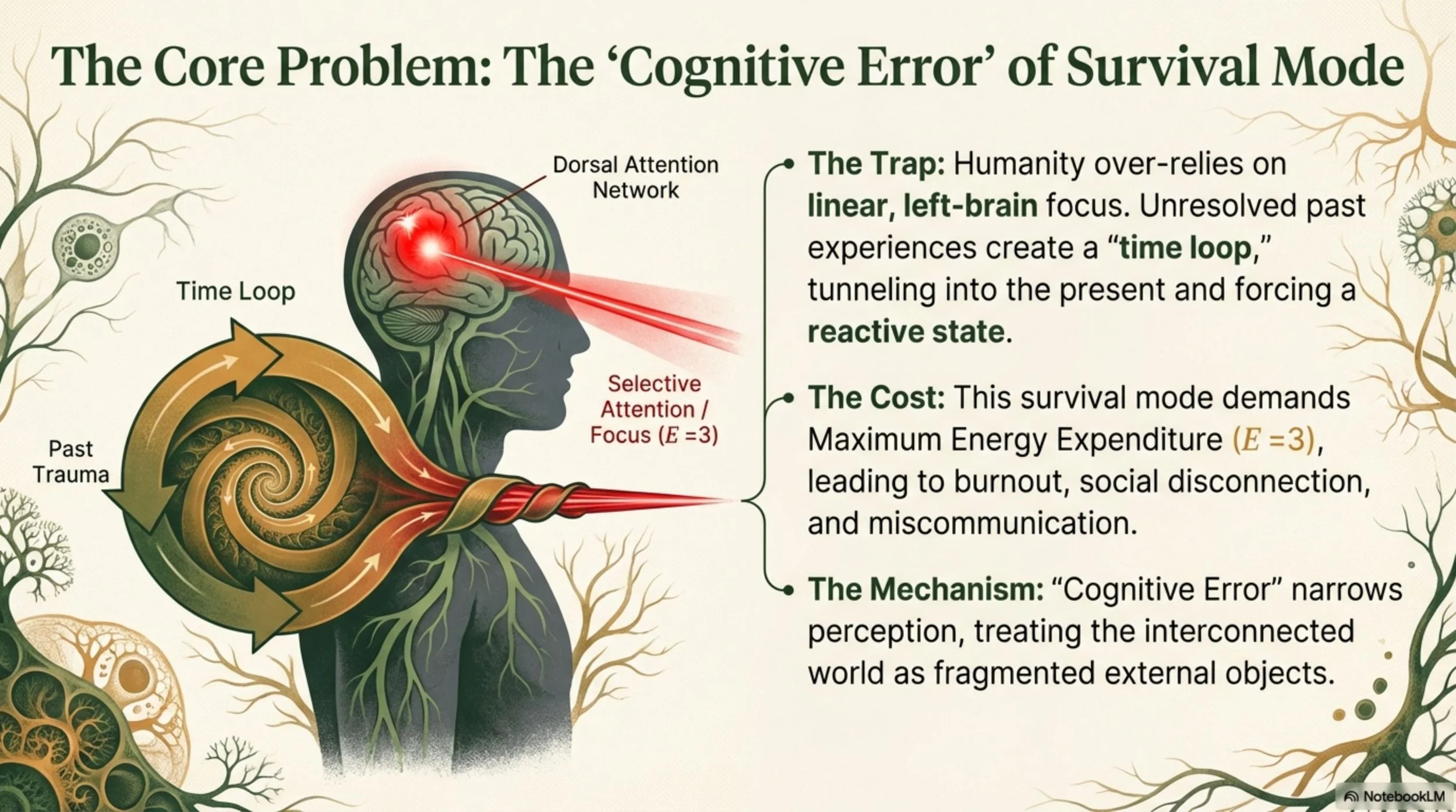 In technology, current Large Language Models (LLMs) often amplify this “cognitive error” by mimicking aforementioned survival-mode language patterns rather than guiding users toward holistic insight.